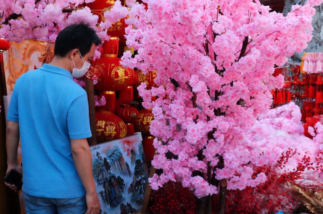 Pedagang menata pohon bunga Mei Hua berbahan plastik yang dijual di kawasan Petak Sembilan, Glodok, Jakarta Barat, Kamis (5/2/2026).