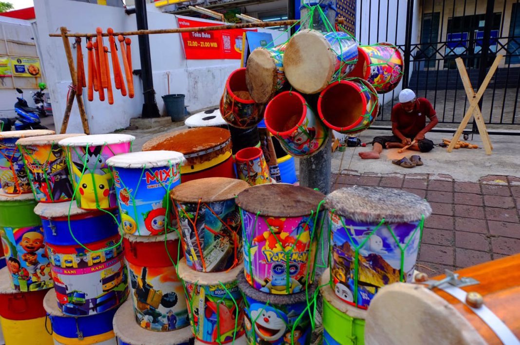 Menjelang Hari Raya Idul Fitri 1446 H, pedagang bedug di Jalan KH Mas Mansyur, Tanah Abang, Jakarta, mulai ramai menjajakan dagangannya. Salah satunya adalah Yadi (36), yang melayani pembeli pada Minggu (23/3/2025).