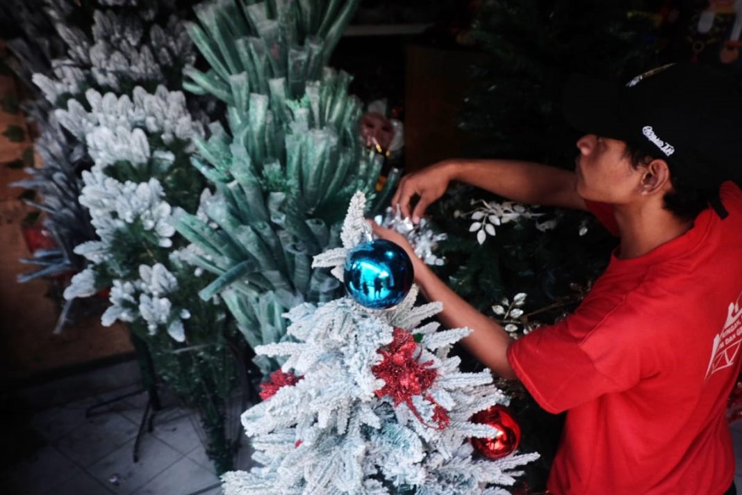Suasana penjualan pernak pernik serta pohon Natal yang terletak di Pasar Pagi,Glodok Jakarta Barat Jumat (20/12/2024 ), umat Nasrani belanja berbagai pernak pernik bertema Natal untuk hiasan pohon.rumah dan gereja. Oeandangan ini difoto Dudut Suhendra Pura, LIma hari menjelang Natal. XPOSEINDONESIA Foto Dudut Suhendra Putra