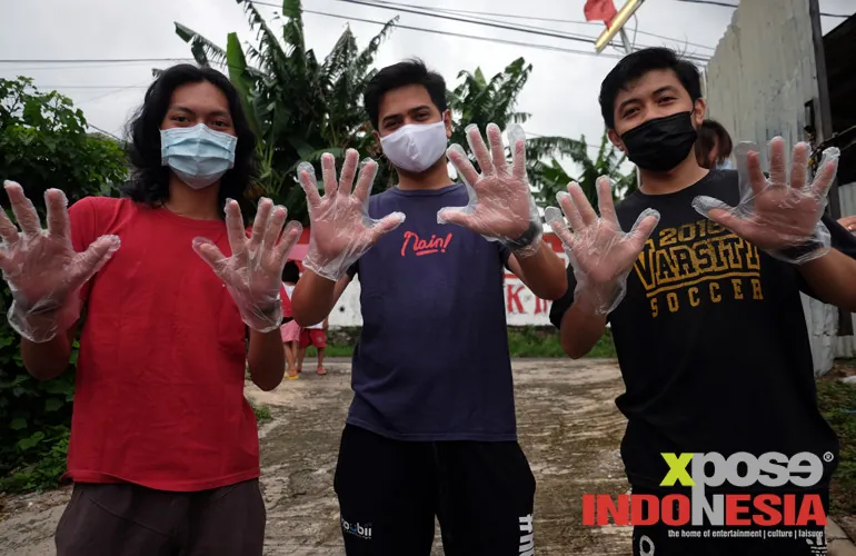 Para petugas KPPS mengingatkan para pemilih yang datang untuk mencuci tangan, menggunakan masker dan memakai sarung tangan plastik sekali pakai saat memasuki pintu masuk TPS. XPOSEINDONESIA/Dudut Suhendra Putra.