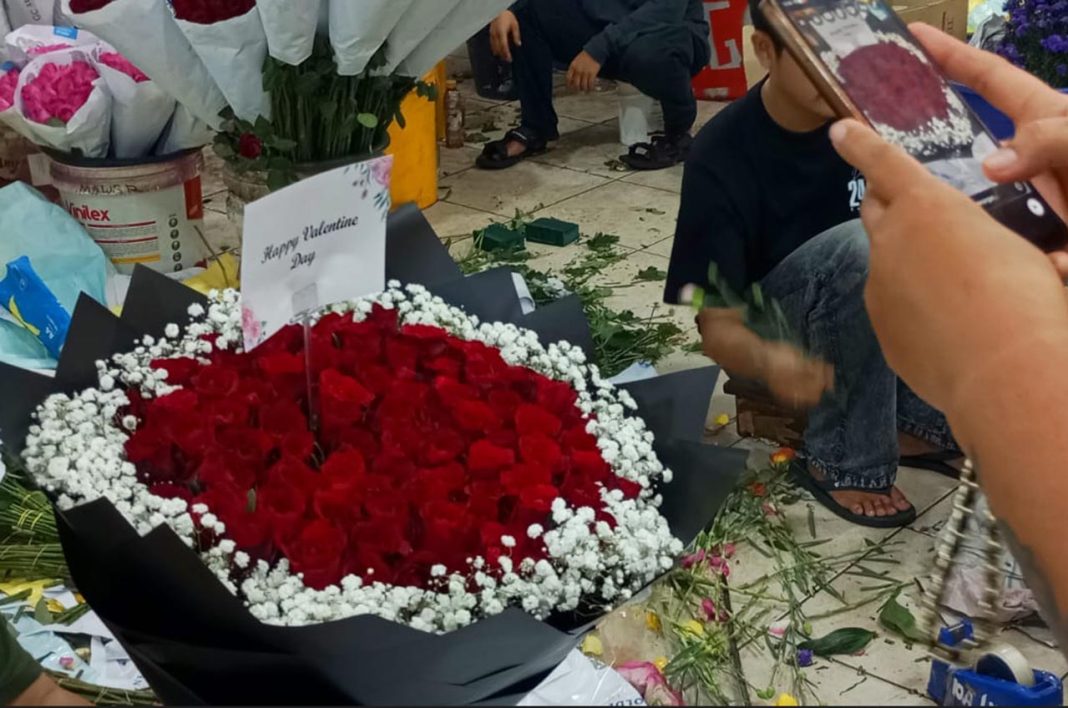 Momentum Hari Kasih Sayang (Valentine Day) membawa berkah bagi para pedagang bunga. Sejak pagi hingga malam, pembeli terus berdatangan untuk mencari rangkaian mawar sebagai hadiah pasangan maupun kerabat. Permintaan tinggi membuat aktivitas perakitan bunga berlangsung tanpa henti.