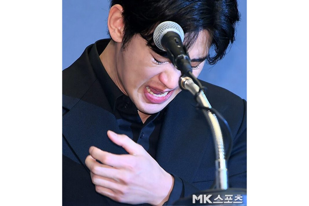 Sepanjang konferensi pers, aktor tersebut menangis dan terus tersedak saat berbicara.