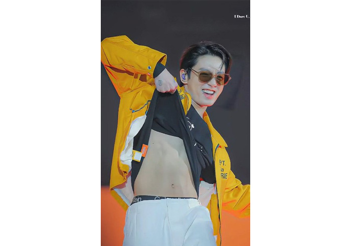 Ingat, sekali waktu di atas panggung, Jungkook menari dengan membuka baju dan memperlihatkan perutnya. Yang terlihat jelas leh penonton adalah merk celana dalamnya yang tertera di bagian pinggang bertuliskan Calvin Klein