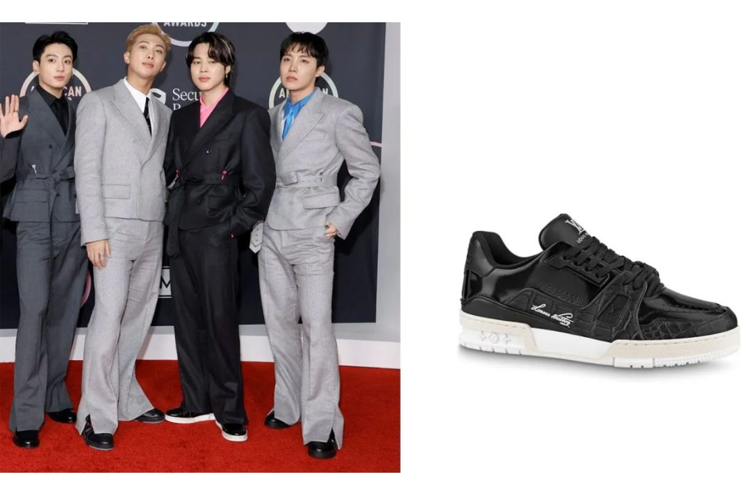 Jimin mengenakan setelan jas hitam, memadukannya dengan kemeja merah muda untuk menambahkan sentuhan lembut. Dan untuk alas kaki, ia memilih sneakers LV trainer berwarna hitam.