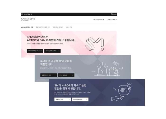 Situs web baru ini dibangun SM Entertainment diberi nama KWANGYA 119 https://kwangya119.smtown.com/?p=1&k=&m=false dibuat dalam upaya untuk memberikan perlindungan yang lebih besar bagi hak dan kepentingan artis di bawah management perusahaan tersebut.