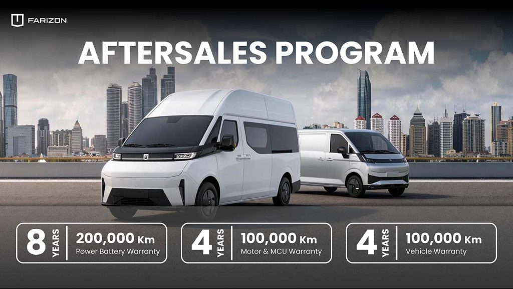Program garansi yang ditawarkan pun cukup kompetitif. Untuk kendaraan penumpang atau umum, Farizon memberikan garansi baterai hingga 8 tahun atau 200.000 km, ditambah garansi motor dan sistem kontrol selama 4 tahun. Sementara untuk segmen kendaraan niaga seperti light truck hingga heavy truck, perlindungan disesuaikan dengan kebutuhan operasional, termasuk opsi jarak tempuh hingga ratusan ribu kilometer.