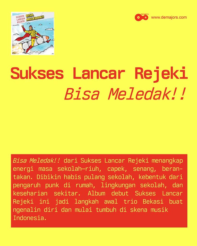 Salah satu rilisan yang paling menyita perhatian datang dari trio punk asal Bekasi, Sukses Lancar Rejeki, lewat album debut bertajuk Bisa Meledak!!. Album ini merekam gairah remaja yang tumbuh di lingkungan sekolah, dengan cerita keseharian yang dekat, jujur, dan penuh semangat. Dikerjakan sepulang sekolah, Bisa Meledak!! lahir dari refleksi lingkungan sekitar para personel—keluarga, ruang belajar, dan pergaulan—yang kemudian diterjemahkan ke dalam energi punk yang spontan dan apa adanya. Album ini menjadi tonggak perkenalan Sukses Lancar Rejeki ke pasar musik Indonesia sekaligus penanda awal proses tumbuh kembang mereka sebagai band.