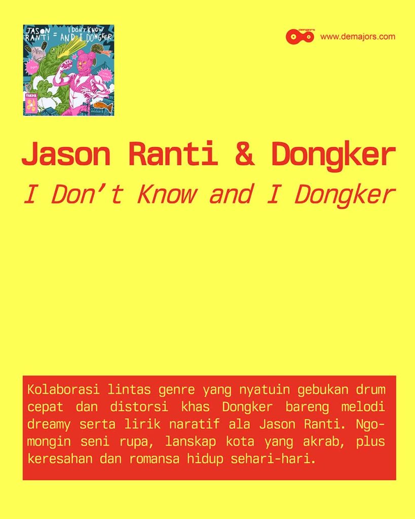 Di ranah kolaborasi, demajors menghadirkan proyek lintas genre yang tak kalah mencolok melalui I Don’t Know and I Dongker, kolaborasi antara Jason Ranti dan Dongker. Karya ini mempertemukan dua dunia yang kontras: gebukan drum cepat dan distorsi gitar khas Dongker dengan melodi dreamy serta lirik naratif ala Jason Ranti. Album ini tidak hanya berbicara soal musik, tetapi juga seni rupa, lanskap kota yang akrab, hingga keresahan dan romansa kehidupan sehari-hari, menjadikannya salah satu rilisan paling unik dan eksploratif sepanjang 2025.