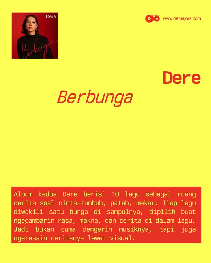 Sementara itu, Dere kembali memperluas narasi musikalnya lewat album kedua berjudul Berbunga. Album yang berisi 10 lagu ini menjadi ruang ekspresi bagi Dere dalam memaknai cinta sebagai sesuatu yang hidup—tumbuh, patah, lalu mekar kembali. Keunikan Berbunga tidak hanya terletak pada materi lagunya, tetapi juga pada pendekatan visualnya. Setiap lagu diwakili oleh satu jenis bunga yang berbeda pada sampul, dipilih secara khusus untuk mencerminkan nuansa, makna, dan cerita di balik masing-masing lagu. Pendekatan ini menjadikan album Berbunga kaya secara musikal sekaligus simbolis.