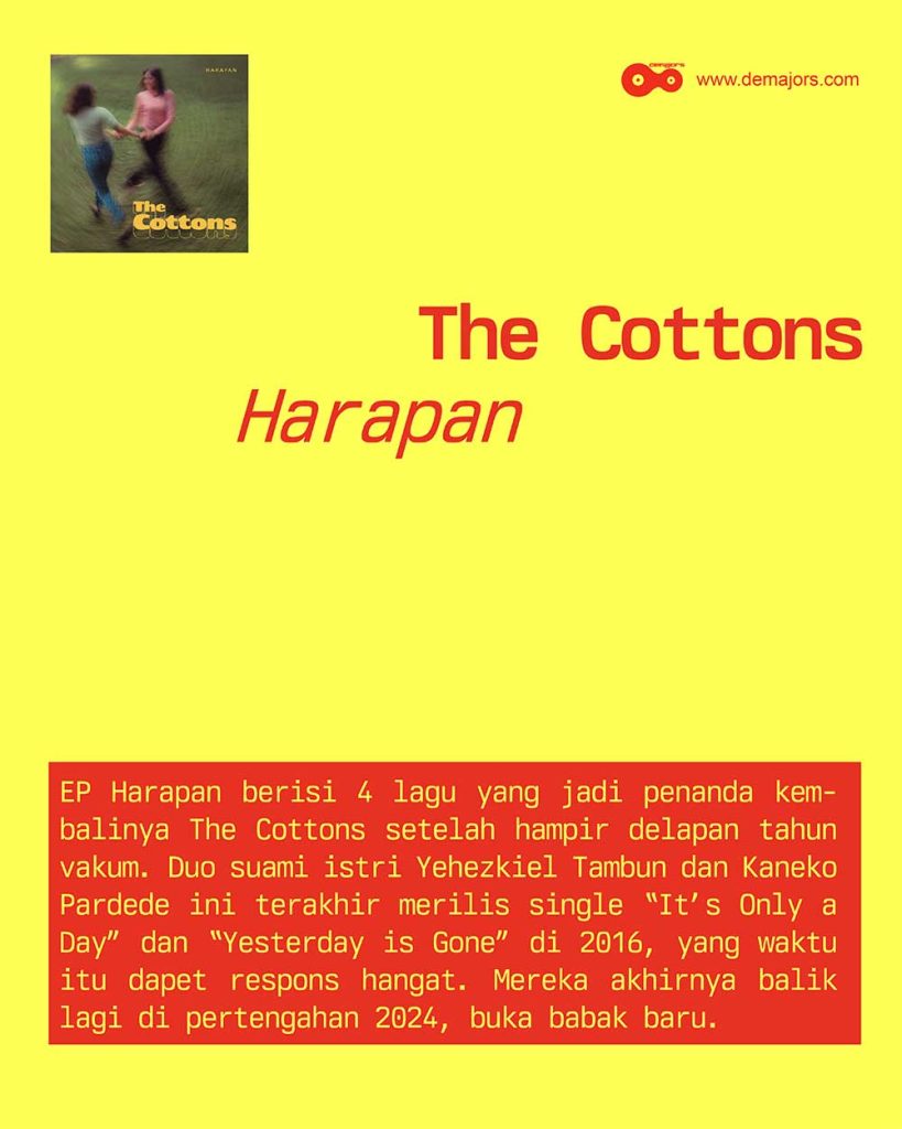 Setelah hampir delapan tahun absen, The Cottons menandai babak baru perjalanan mereka lewat EP Harapan. Duo suami istri Yehezkiel Tambun dan Kaneko Pardede ini kembali dengan empat lagu yang membuka musim baru dalam karier mereka sejak kembali aktif di pertengahan 2024. Sebelumnya, The Cottons sempat merilis single “It’s Only a Day” dan “Yesterday is Gone” pada 2016 yang mendapat respons positif. EP Harapan hadir sebagai lanjutan kedewasaan musikal mereka, dengan nuansa reflektif yang hangat dan jujur.