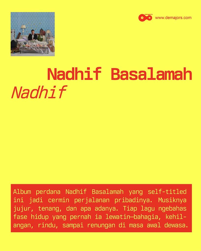 Dari sisi solois, Nadhif Basalamah memperkenalkan album perdananya yang berjudul Nadhif, sebuah album self-titled yang merepresentasikan perjalanan personal sang musisi. Album ini menggambarkan esensi musik Nadhif yang tenang, jujur, dan autentik, dengan setiap lagu merekam fase-fase kehidupan yang ia lalui—mulai dari kebahagiaan, kehilangan, kerinduan, hingga perenungan di masa awal dewasa. Pemilihan judul Nadhif menegaskan kesan personal dan kedekatan emosional yang ingin disampaikan kepada pendengar.